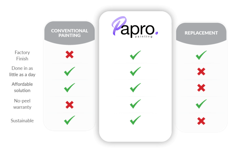 Did you know brand-new siding, doors & windows are actually painted in a factory? With our proprietary weather-adjustable formulations and The Papro Painting, we reverse-engineer the controlled process of factory painting to bring you an on-site factory finish.